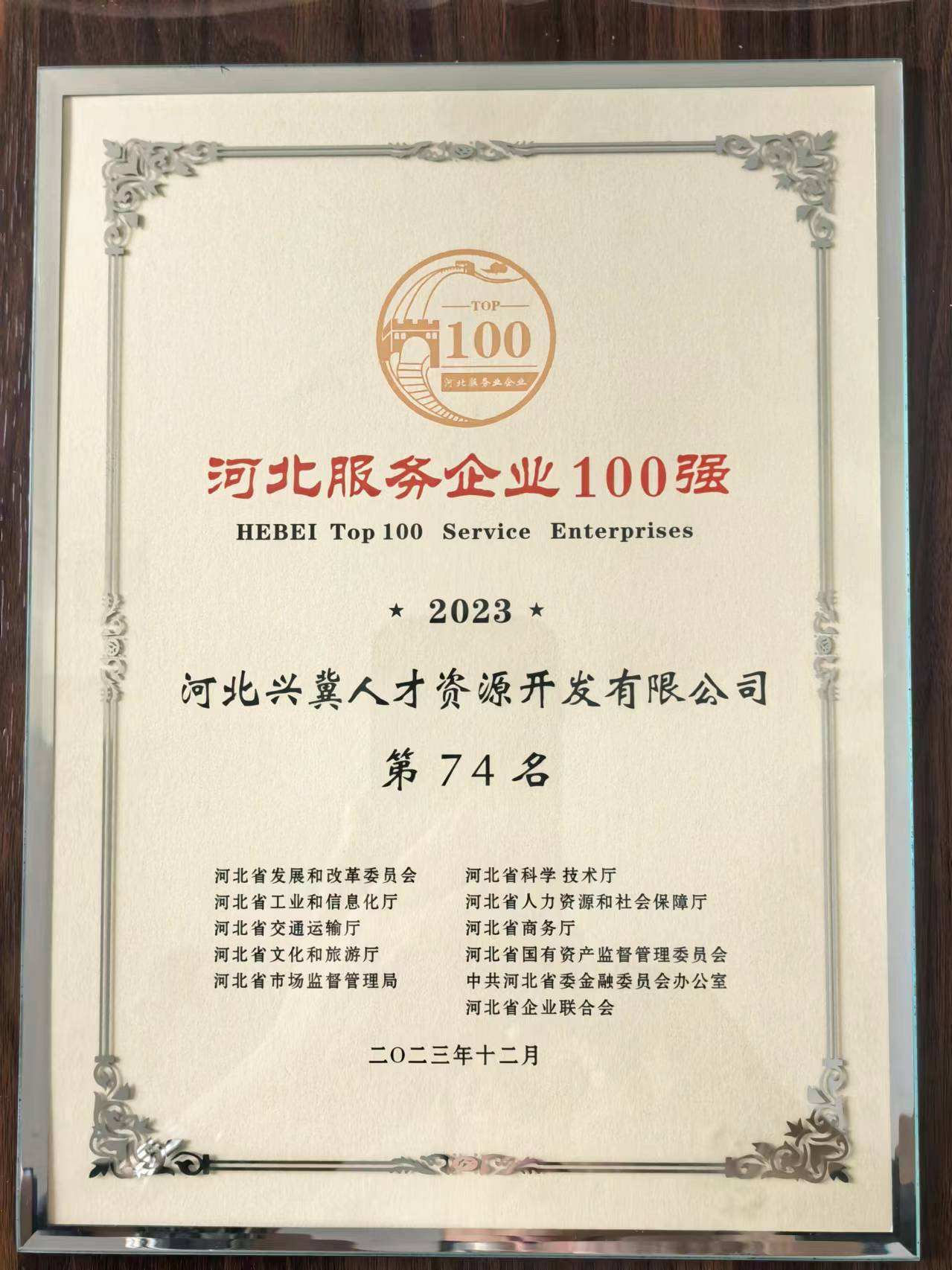 為發(fā)揮服務(wù)業(yè)龍頭企業(yè)示范帶頭作用,深化改革創(chuàng)新,加快構(gòu)建優(yōu)質(zhì)高效的服務(wù)業(yè)新體系,推動(dòng)全省服務(wù)業(yè)高質(zhì)量發(fā)展,省發(fā)改委、省國(guó)資委等11部門(mén)聯(lián)合開(kāi)展“2023河北服務(wù)業(yè)企業(yè)100強(qiáng)和創(chuàng)新領(lǐng)先50強(qiáng)”評(píng)選工作。興冀人才公司成功入圍“2023河北服務(wù)業(yè)企業(yè)100強(qiáng)”榜單,公司經(jīng)營(yíng)發(fā)展成效及業(yè)務(wù)服務(wù)水平獲得業(yè)內(nèi)外一致認(rèn)可。