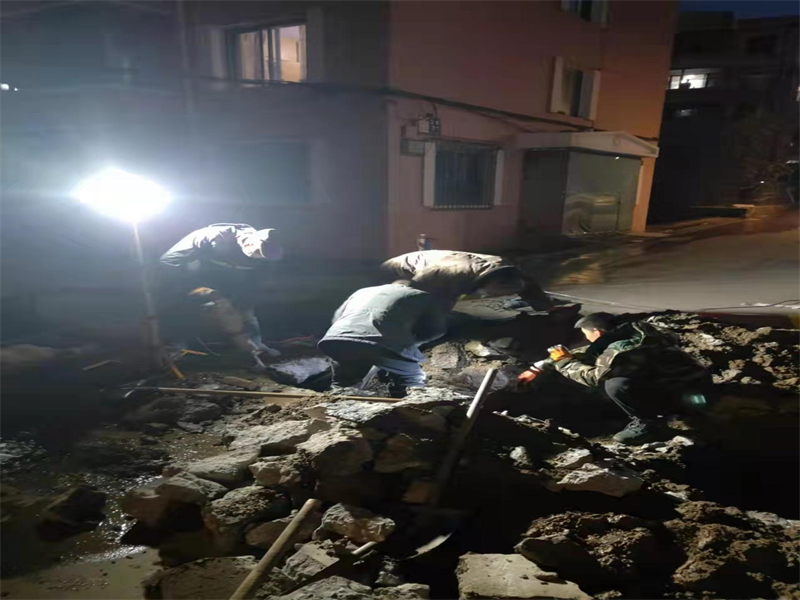 深夜搶修,無怨無悔。11月6日上午,營業二分公司接到測漏公司通知,金域華城別墅區下方車庫檢測到兩處漏點。維修人員趕到現場開始施工,到16時左右,坑里全是泥沙,管深3米,地面到屋頂3.2米,車庫門高2.6米,無法人工挖掘。在維修現場,冬日的寒夜里支起了一盞盞照明燈,維修人員聯系鉤機入場,一直挖到深夜零點。由于土方量太大,土倒不出來,工作人員隨即又聯系一臺鉤機。兩臺鉤機連續作業,絲毫不敢松懈,一系列工序緊張而有序。時間一分一秒地過去,一直到次日凌晨4時,終于將漏點修復,凌晨6時回填完畢,確保了百姓早高峰正常用水。
