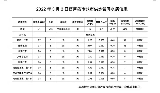 2022年3月2日葫蘆島市城市供水管網水質信息