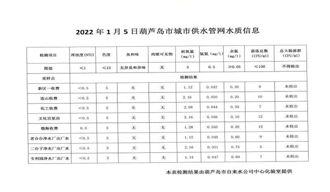 2022年1月5日葫蘆島市城市供水管網水質信息