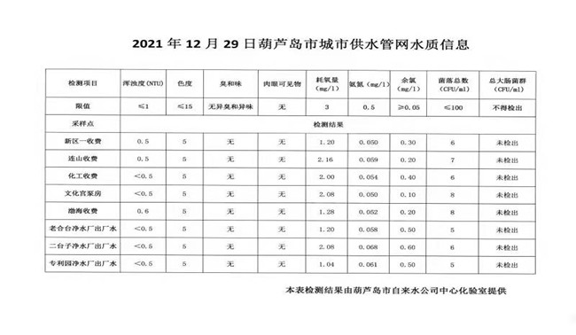 2021年12月29日葫蘆島市城市供水管網水質信息