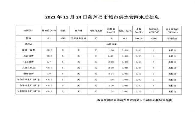 2021年11月24日葫蘆島市城市供水管網水質信息