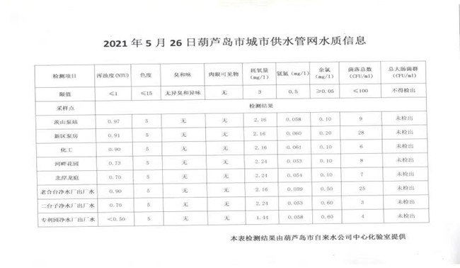 2021年5月26日葫蘆島市城市供水管網水質信息