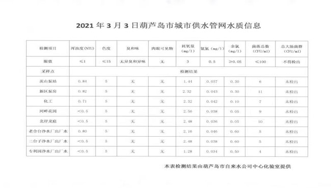 2021年3月3日葫蘆島市城市供水管網水質信息