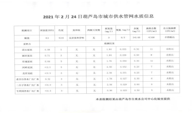 2021年2月24日葫蘆島市城市供水管網水質信息