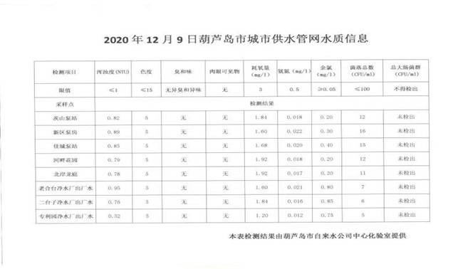 2020年12月9日葫蘆島市城市供水管網水質信息