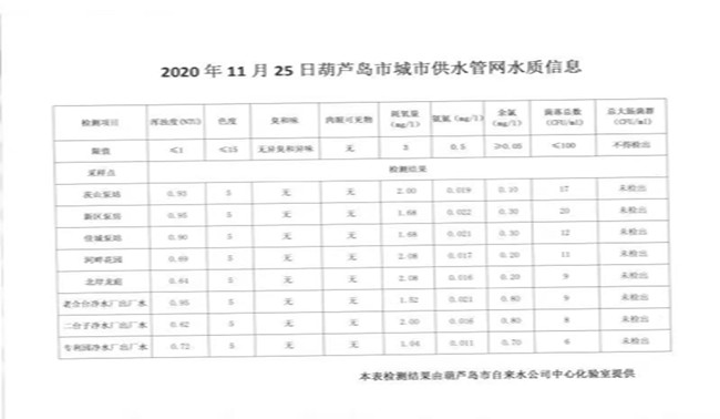 2020年11月25日葫蘆島市城市供水管網水質信息