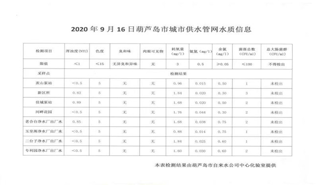2020年9月16日葫蘆島市城市供水管網水質信息