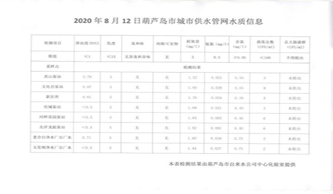 2020年8月12日葫蘆島市城市供水管網水質信息