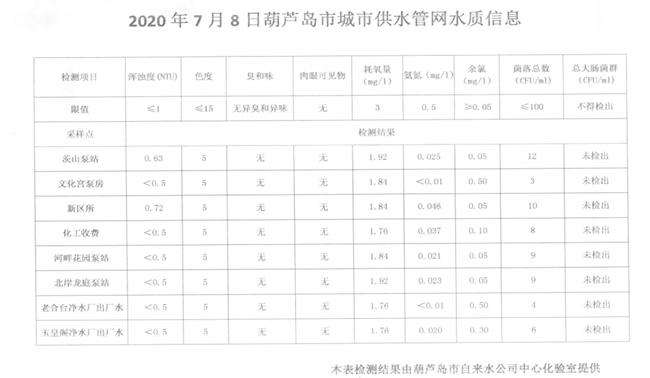 2020年7月8日葫蘆島市城市供水管網水質信息