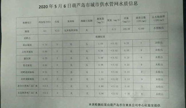 2020年5月6日葫蘆島市城市供水管網水質信息
