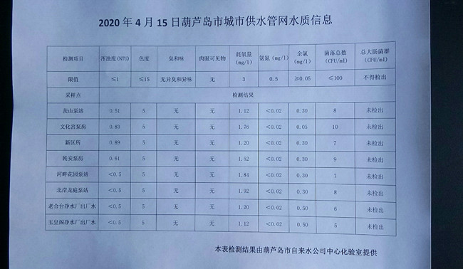 2020年4月15日葫蘆島市城市供水管網水質信息
