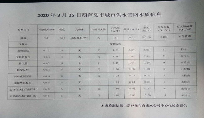 2020年3月25日葫蘆島市城市供水管網水質信息