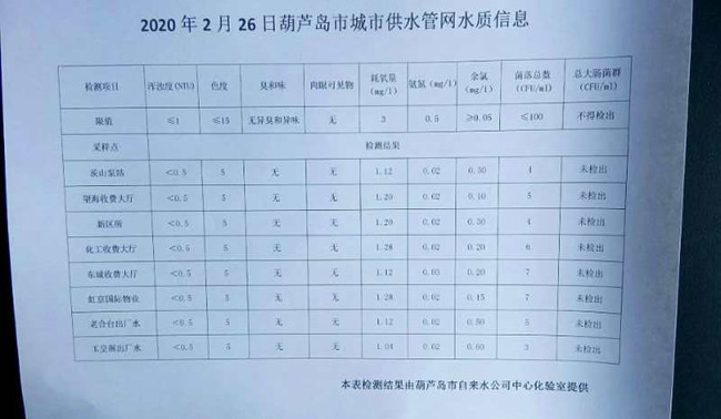 2020年2月26日葫蘆島市城市供水管網水質信息