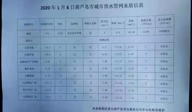 2020年1月8日葫蘆島市城市供水管網水質信息