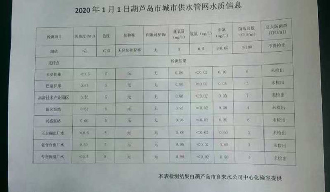 2020年1月1日葫蘆島市城市供水管網水質信息