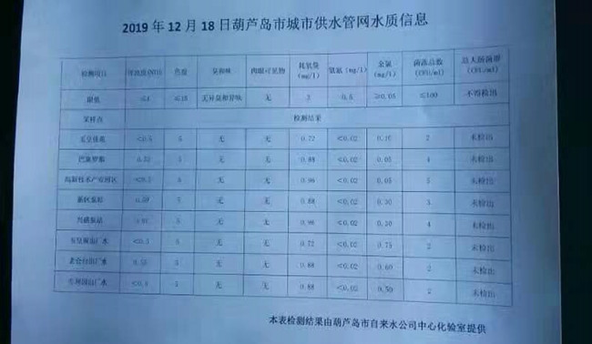 2019年12月18日葫蘆島市城市供水管網(wǎng)水質信息