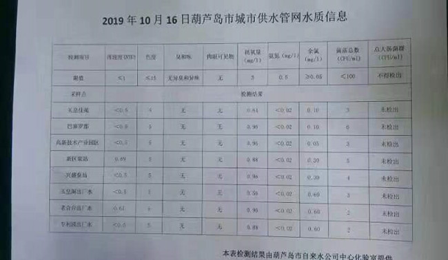 2019年10月16日葫蘆島市城市供水管網水質信息