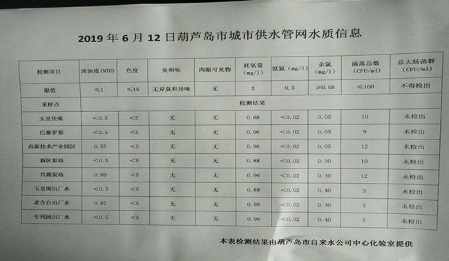 2019年6月12日葫蘆島市城市供水管網水質信息