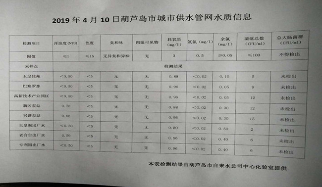 2019年4月10日葫蘆島市城市供水管網水質信息
