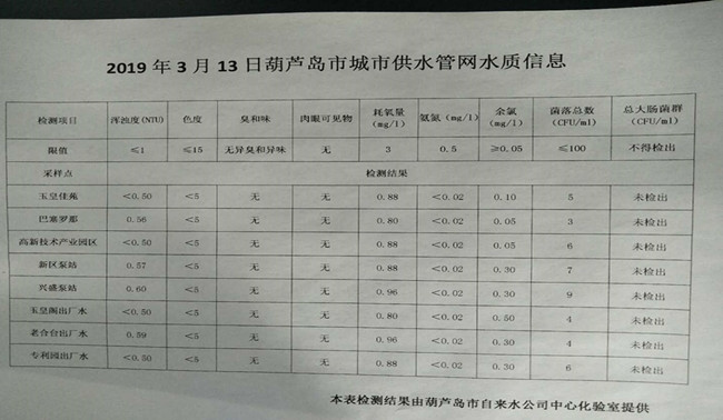 2019年3月13日葫蘆島市城市供水管網水質信息