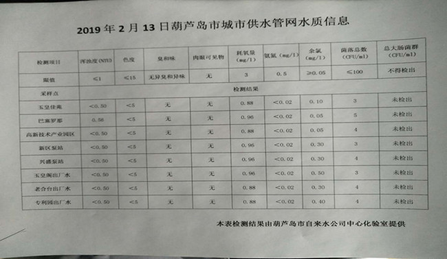 2019年2月13日葫蘆島市城市供水管網水質信息