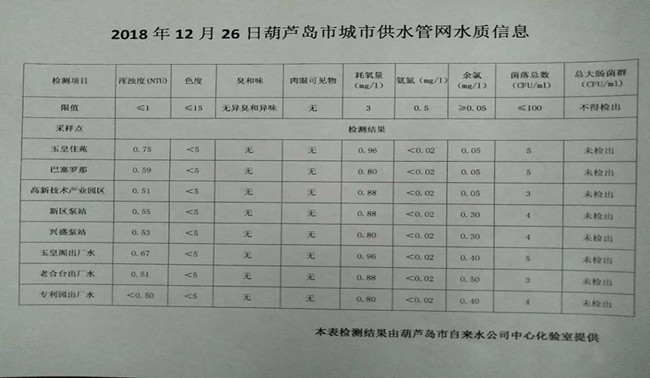 2018年12月26日葫蘆島市城市供水管網水質信息
