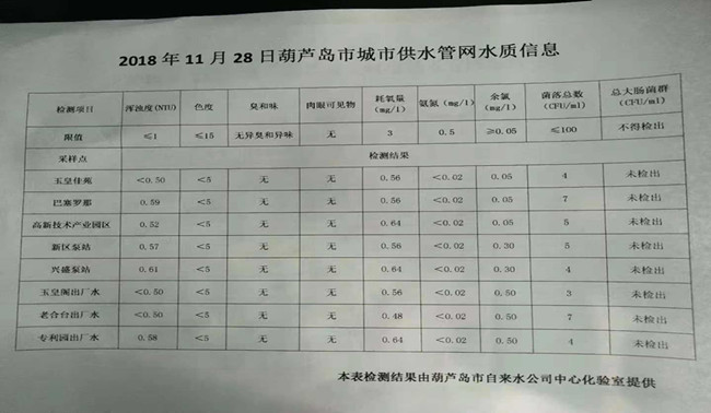 2018年11月28日葫蘆島市城市供水管網水質信息