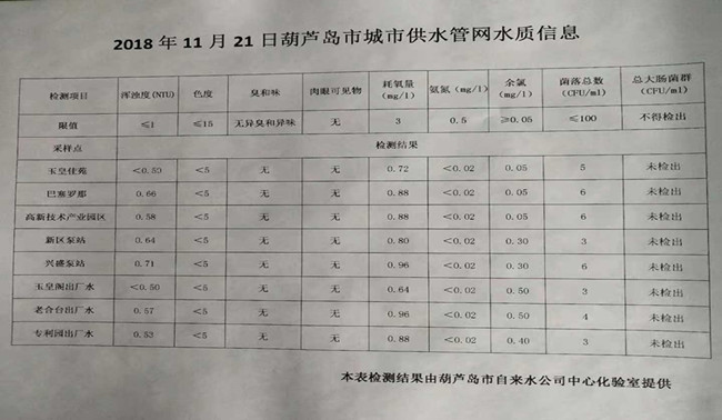 2018年11月21日葫蘆島市城市供水管網水質信息