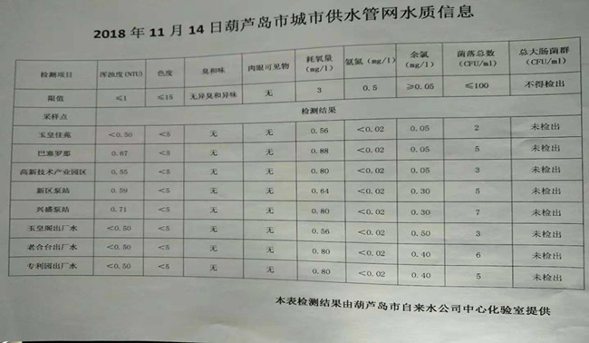 2018年11月14日葫蘆島市城市供水管網水質信息
