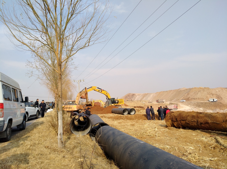 當天下午4時,市自來水工程總公司抽調的35名搶修精干力量投入搶修作業,同時出動大型挖掘機3臺,搶修設備包括大小發電機組7臺,水泵3臺,電焊機6臺。搶修難度遠比預想的要困難得多。地下管線十分復雜,破損點位排查困難,實施停水作業后,最終確定破損位置,因次生土壤塌方將200余延長米管線壓斷,并且破口較大,經現場有關技術人員一致研究決定采取徹底換管的方案。由于受損管線長達200余米,并且管徑大,原材料庫存少,公司材料處當場聯系,緊急調動新管線。搶修過程中,需要穿越鋅廠位于地下2.2米深的DN800供水管線,使新的輸水管線需要深挖至6米深的地下實施安裝。并且安裝的管邊離1萬伏的電纜不到1米遠,十分危險,為保障安全,施工中先用吊車、挖掘機扶住電線桿子后再作業。初冬的11月份,深夜氣溫驟降。搶修人員冒著零下十幾度的嚴寒,輪流吃飯,舍不得片刻休息,搶時間、爭速度。