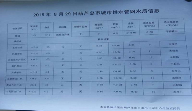 2018年8月29日葫蘆島市城市供水管網水質信息