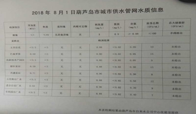2018年8月1日葫蘆島市城市供水管網水質信息