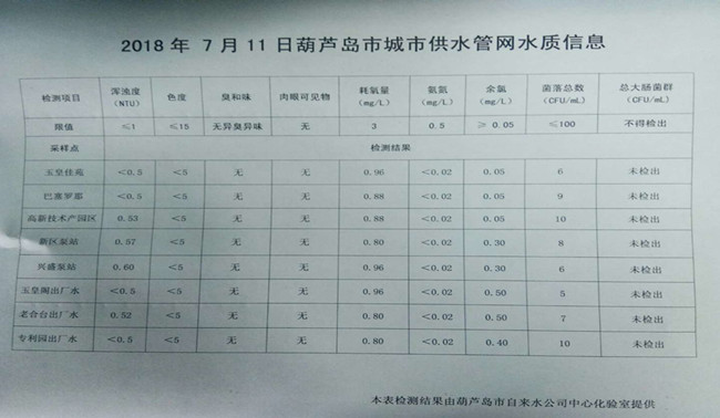 2018年7月11日葫蘆島市城市供水管網水質信息