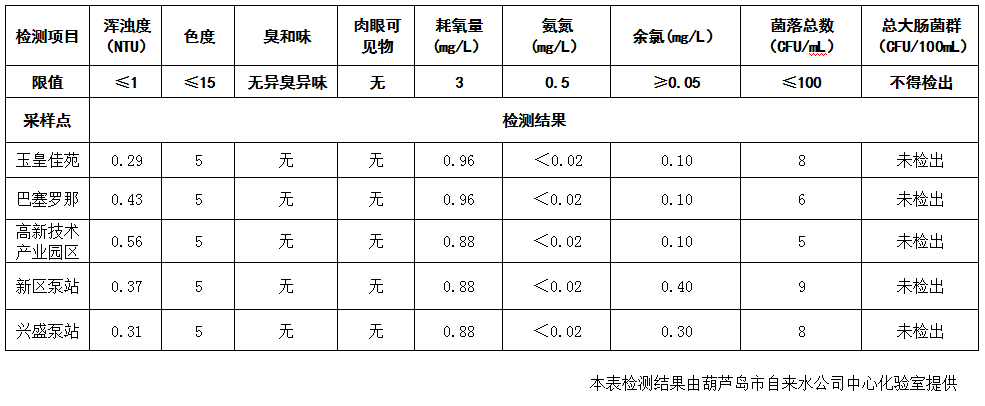 2017年8月30日葫蘆島市城市供水管網水質信息