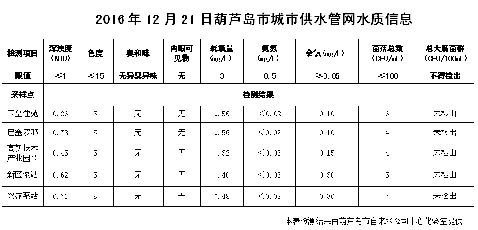 2016年12月21日葫蘆島市城市供水管網水質信息